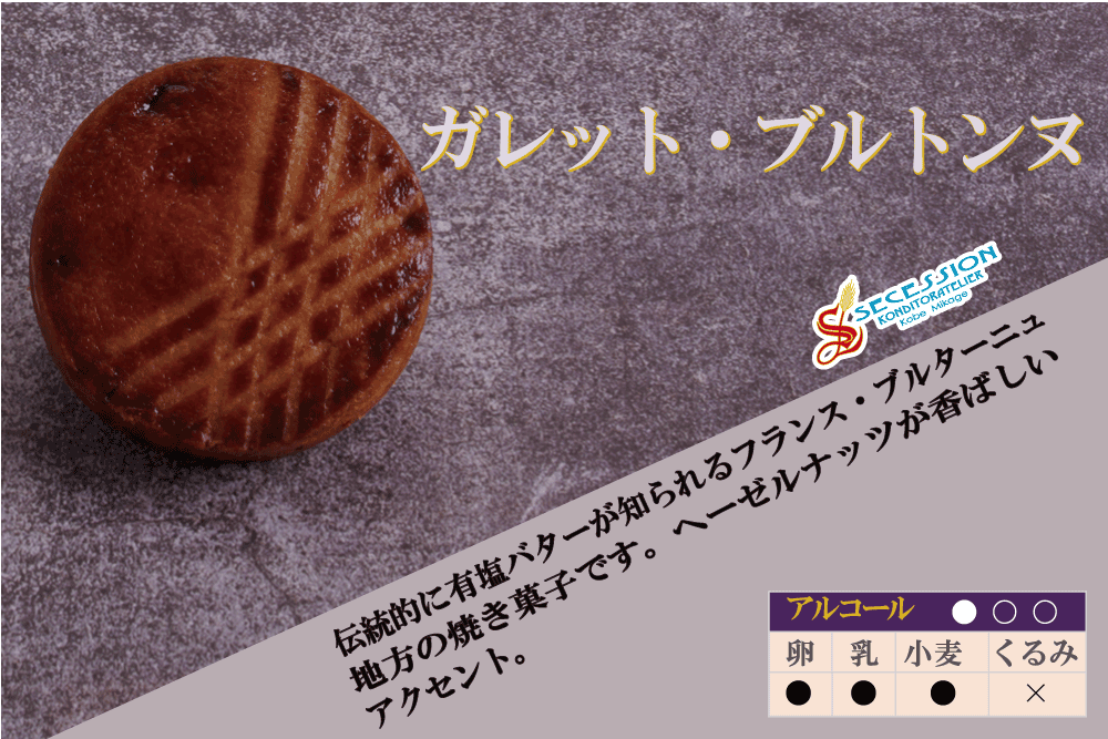 ガレット・ブルトンヌ:小麦粉、砂糖、バター、卵黄、ヘーゼルナッツ、アーモンド、ラム酒、バニラ