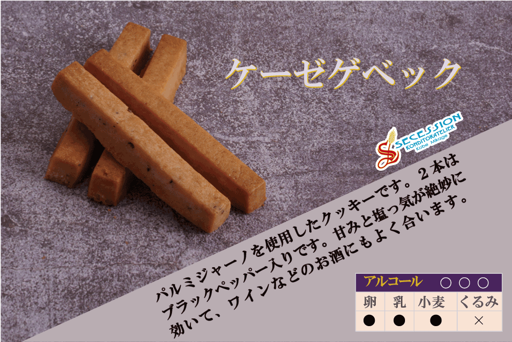 ケーゼゲベック:小麦粉、有塩バター、砂糖、卵白、パルミジャーノ、コーンスターチ、黒胡椒