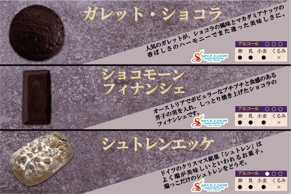 ショコモーン・フィナンシェ:卵白、発酵バター、砂糖、小麦粉、けしの実、チョコレート、ココア、転化糖(一部に乳成分、小麦、卵、大豆を含む)