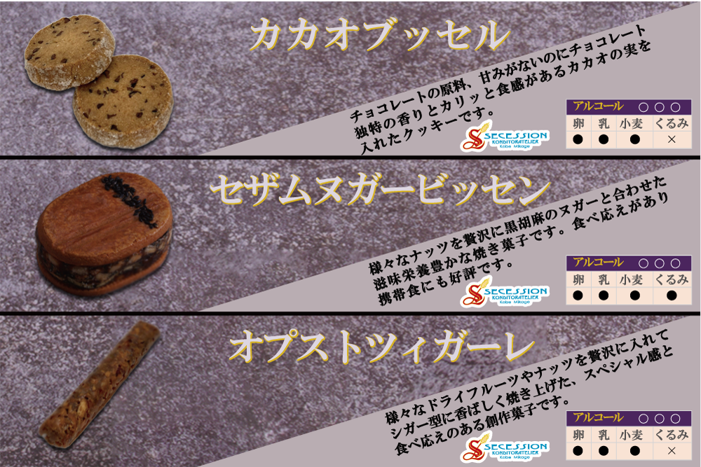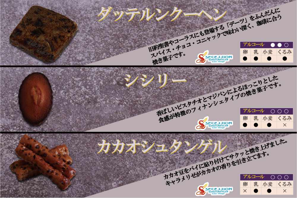 セザムヌガービッセン:砂糖、生クリーム、胡麻、南瓜の種、蜂蜜、バター、くるみ、松の実、ヘーゼルナッツ、アーモンド、レーズン、小麦粉、卵、水飴、バニラ、塩(一部に乳成分・小麦・卵・アーモンドを含む)
