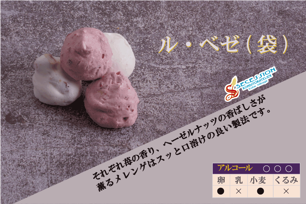 ル・ベゼ(袋):ヘーゼルナッツ、卵白、砂糖、アーモンド、ドライストロベリー、濃縮いちご果汁(一部に卵、アーモンドを含む)
