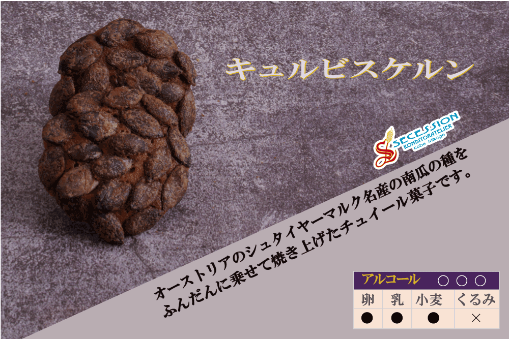 キュルビスケルン:小麦粉、有塩バター、卵白、砂糖、生クリーム、南瓜の種、バニラ、塩(一部に乳成分、卵、小麦、アーモンドを含む)