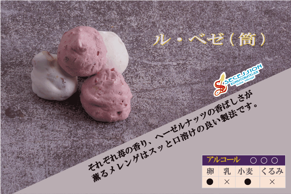 ル・べゼ(筒):ヘーゼルナッツ、卵白、砂糖、アーモンド、ドライストロベリー、濃縮いちご果汁(一部に卵、アーモンドを含む)