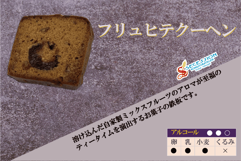 フリュヒテクーヘン:フルーツ洋酒漬け、小麦粉、バター、卵、砂糖、赤糖、ヘーゼルナッツプードル、シナモン、ベーキングパウダー(一部に乳成分、卵、小麦、アーモンドを含む)