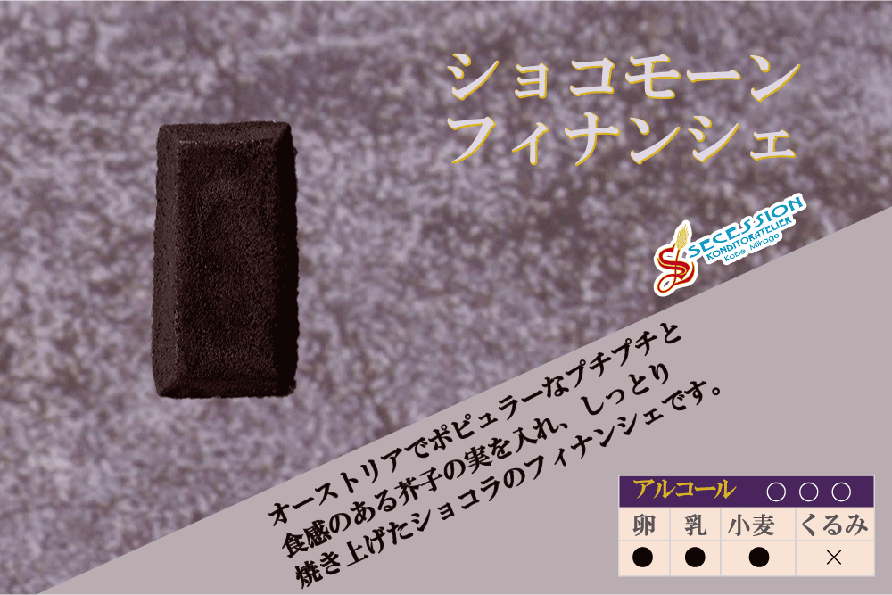 ショコモーン・フィナンシェ:卵白、発酵バター、砂糖、小麦粉、けしの実、チョコレート、ココア、転化糖(一部に乳成分、小麦、卵、大豆を含む)