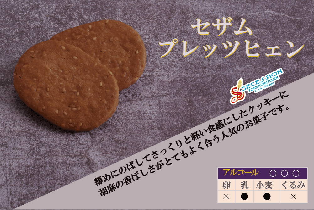 セザム・プレッツヒェン:小麦粉、有塩バター、砂糖、コーンスターチ、ごま(一部に小麦、乳成分を含む)