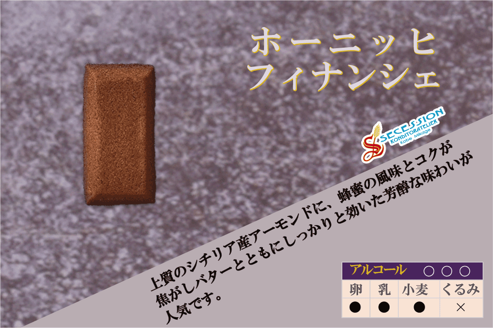 ホーニッヒ・フィナンシェ:発酵バター、卵白、アーモンド、砂糖、蜂蜜、小麦粉(一部に乳成分、卵、小麦、アーモンド含む)