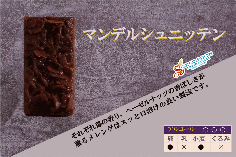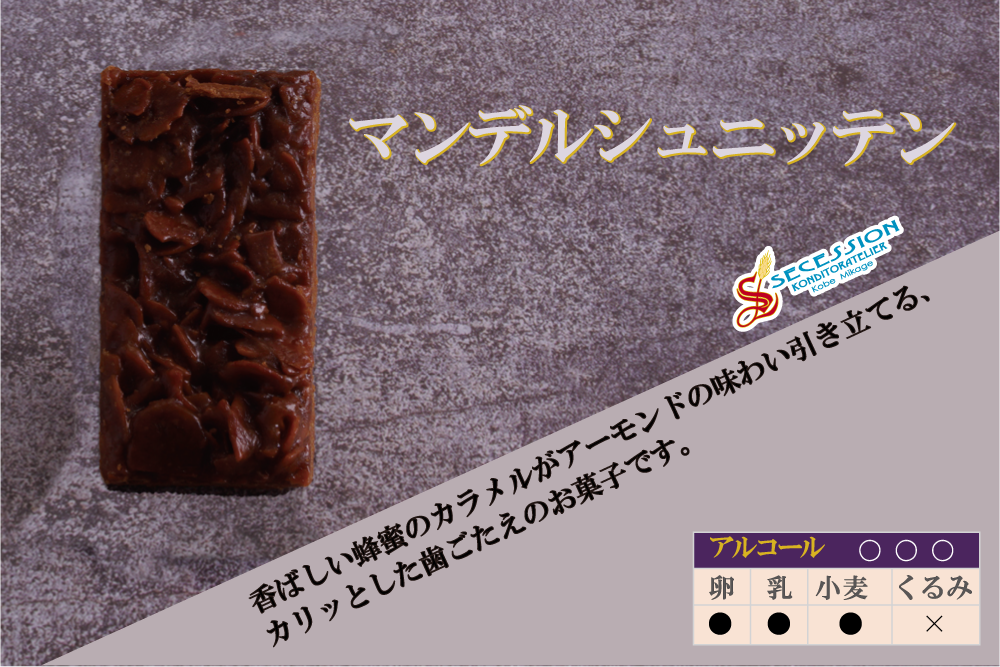 マンデルシュニッテン:アーモンド、発酵バター、砂糖、蜂蜜、小麦粉、水飴、あんず、ジャム、生クリーム(一部に乳成分、小麦、卵、アーモンドを含む)