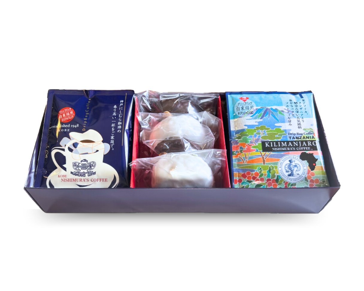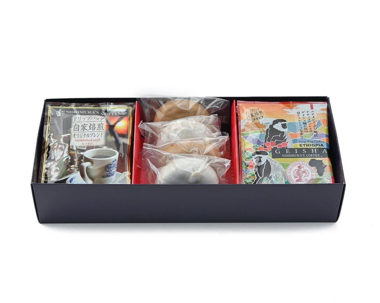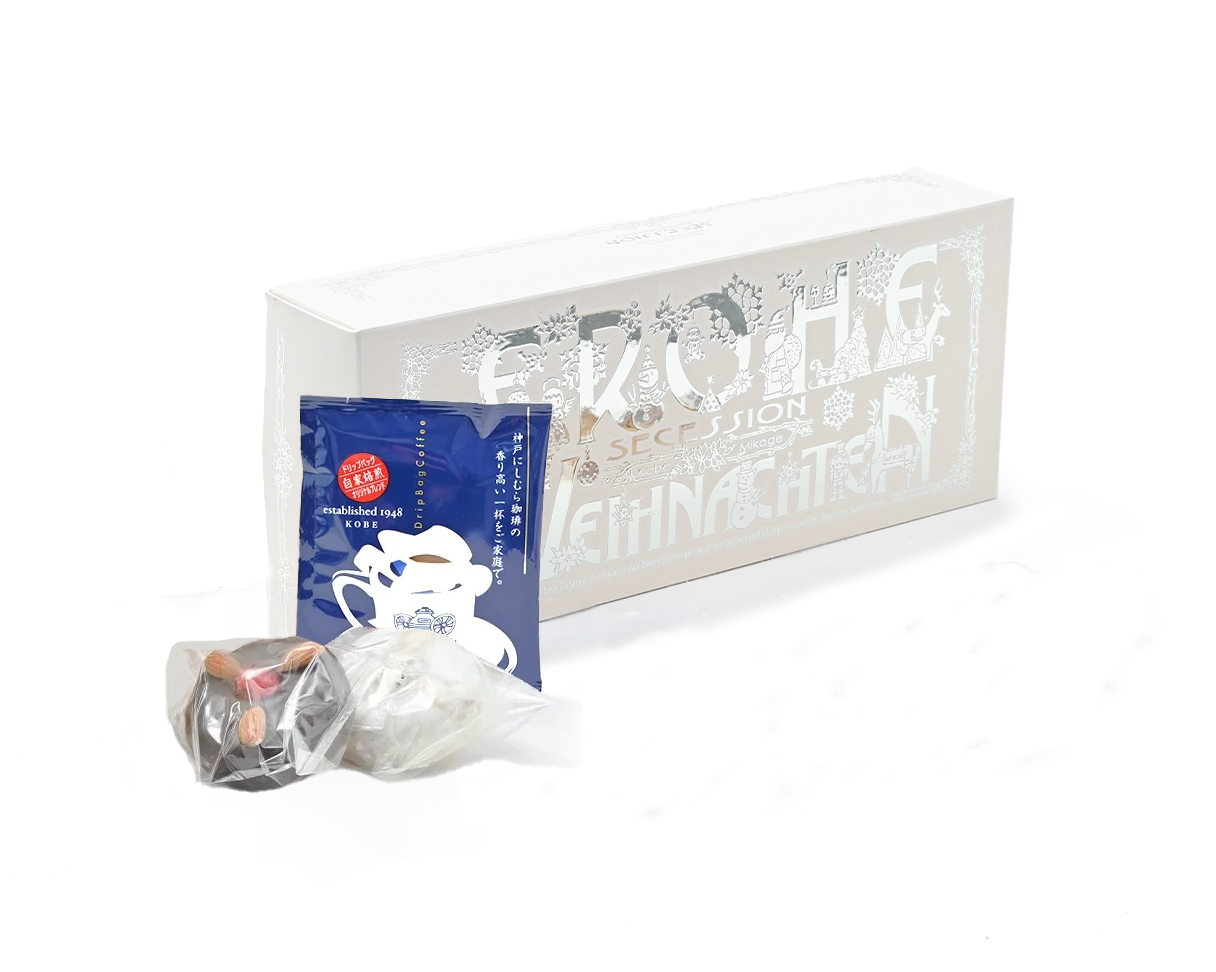 たっぷり14袋のドリップバッグアソートと一緒にセセシオンの独創的な焼き菓子をお楽しみ頂けるギフトです。名物レープクーヘン2種×2個(フォンダンとショコラ:4月中旬より夏季の期間はショコラからカフェに切り替わります。)のセットとなります。