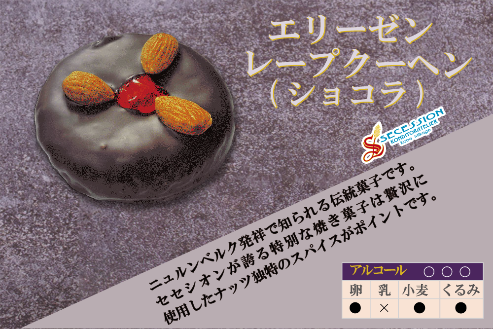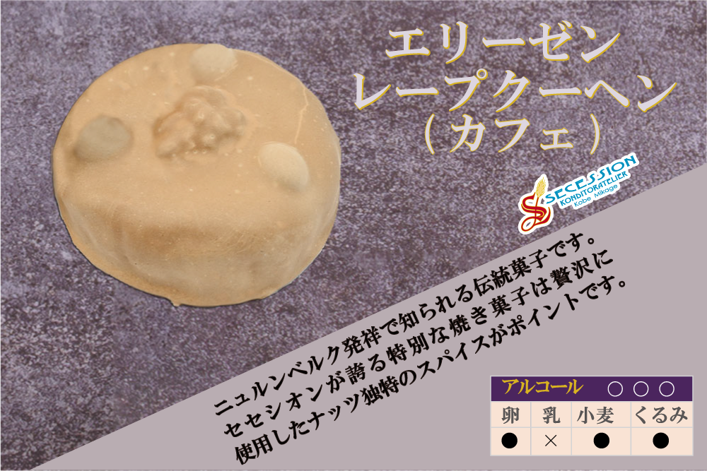 エリーゼン・レープクーヘン(カフェ):フォンダン、マジパン、アーモンド、砂糖、ヘーゼルナッツ、卵白、オレンジピール、レモンピール、くるみ、オブラート、コーヒー抽出液、コーヒー豆、ミルクチョコ、小麦粉、香辛料/アンモニウム(一部に乳成分、卵、小麦、アーモンド、くるみ、大豆を含む)