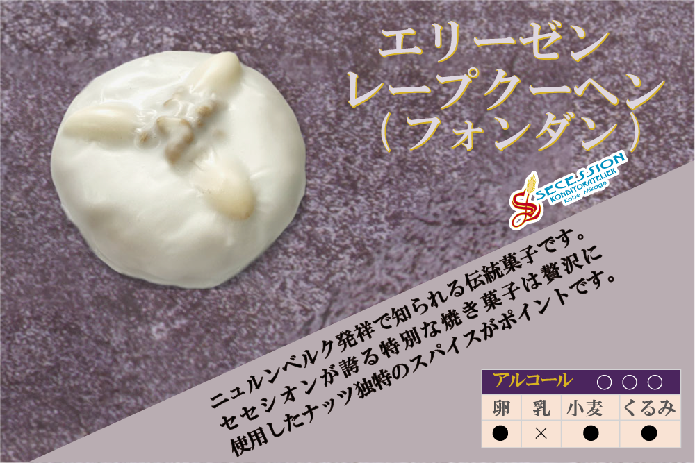 エリーゼン・レープクーヘン(フォンダン):フォンダン、マジパン、アーモンド、砂糖、ヘーゼルナッツ、卵白、オレンジピール、レモンピール、くるみ、オブラート、小麦粉、香辛料/アンモニウム(一部に卵、小麦、アーモンド、くるみを含む)